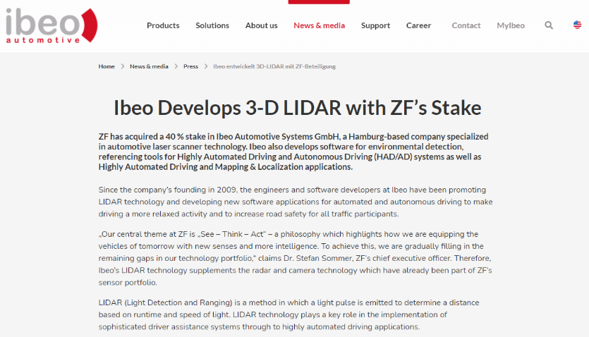 2016年8月,德国采埃孚收购了Ibeo公司40%的股权,共同开发固态激光雷达。