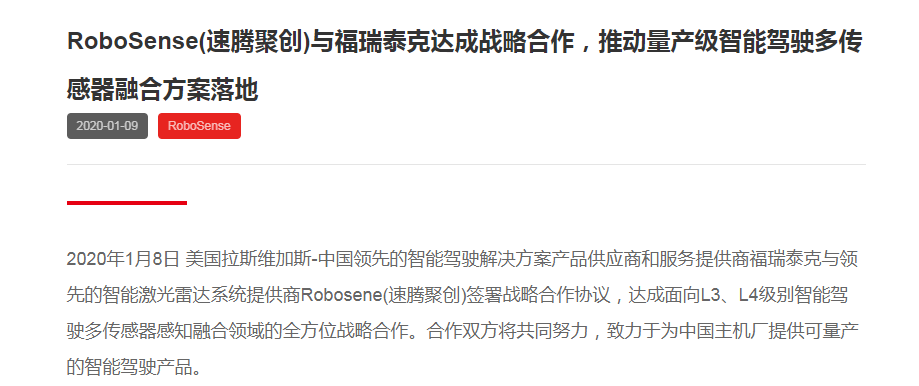 2020年1月,福瑞泰克与RoboSense签署战略合作协议,达成面向L3、L4级别智能驾驶多传感器感知融合领域的战略合作。