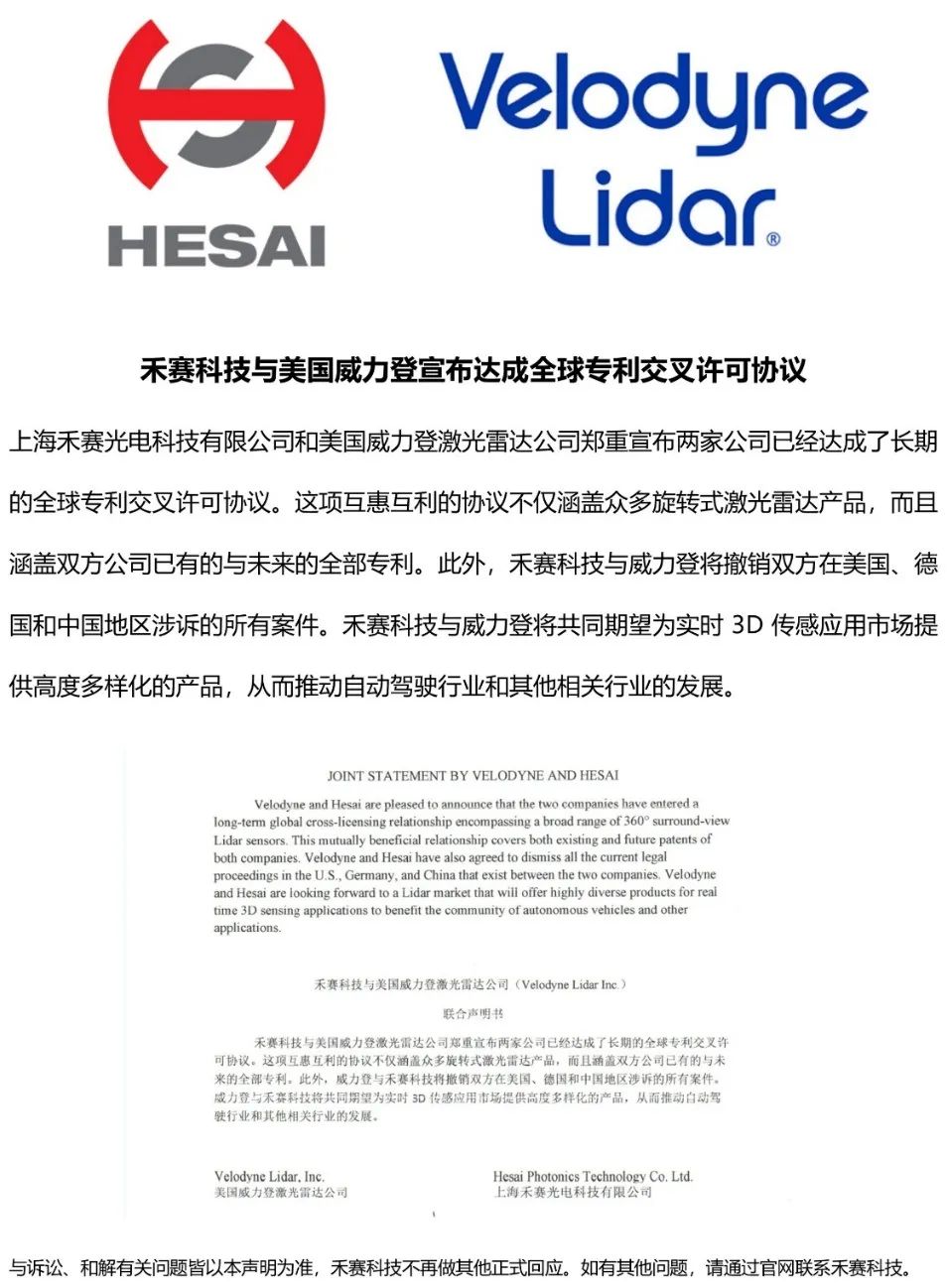 在这中间还有一段小插曲,起因是2019年8月Velodyne在指控禾赛科技侵犯其在美国注册的旋转式激光雷达相关专利,随之禾赛科技在德国和中国上海指控Velodyne侵犯其在旋转式激光雷达相关专利。2020年6月24日,禾赛科技与Velodyne签署《诉讼和解和专利交叉许可协议》,并向Velodyne签订十年期专利补偿协议(协议有效期限至2030年2月26日),10年专利费总计约1.6亿元人民币。