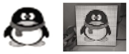 本设计采用32位嵌入式微处理器STM32F103ZET6和可编程逻辑器件EP1C6Q240C8设计了全彩色LED显示屏控制系统,并在实验室验证,实现了LED显示屏的彩色显示,图6(a)为一幅实际图像,图6(b)是在显示屏上的显示效果。