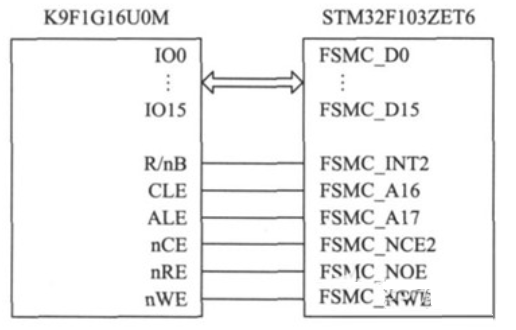 FLASH采用的是三星公司的K9F1G16U0M,它是一种NAND型FLASH,存储容量为64M16位,工作电压3.3V,系统中STM32F103ZET6与K9F1G16U0M的连接如图2所示。FLASH存储器的IO0~IO7和FMSC数据总线的低8位相连,STM32处理器通过FSMC访问存储器;FLASH存储器的片选信号nCE和FSMC的FSMC_NCE2相连接,这样存储器的地址空间为0x70000000~077FFFFFFFF;FLASH存储器的R/nB连接至STM32处理器的FSMC_NWAIT管脚,处理器将R/nB作为一个中断源使用,因此可以在存储器的等待周期内执行其他的任务。