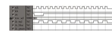 扫描驱动输出信号的仿真波形如图5所示,其中en是灰度控制信号,用来控制显示时间,产生灰度效果;row_sel是行选信号,显示时用于确定点亮哪一行;sck是移位时钟,lck是锁存时钟,ds_red、ds_blue、ds_green是上屏红、蓝、绿数据的输入端。仿真时红、蓝、绿显示数据分别设定为01交错、全1、全0。可以看到,在移位时钟的作用下数据移位正确,移位完成后,lck变为高电平,将数据锁存输出到LED屏上显示。
