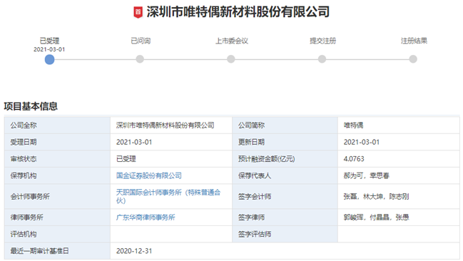 3月1日,深交所正式受理了深圳市唯特偶新材料股份有限公司(以下简称:唯特偶)创业板上市申请。