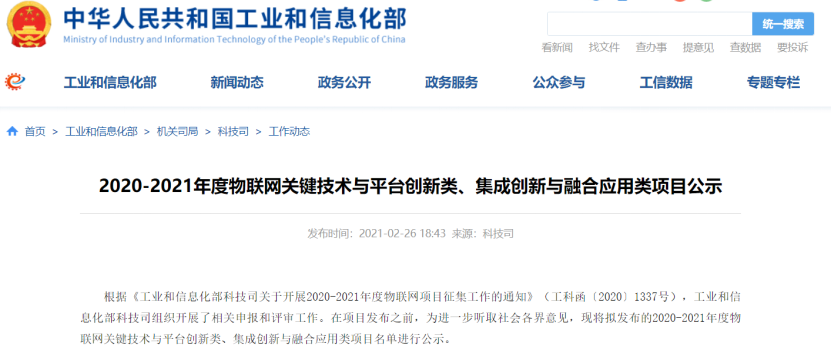 2021年03月02日 | 工信部公示2020-2021年度国家物联网项目,锐成芯微等入列