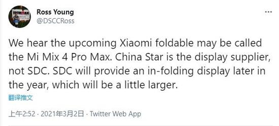 3月2日消息,业内人士Ross Young爆料,小米折叠屏手机可能会命名为小米MIX 4 Pro Max,由华星光电提供折叠面板。