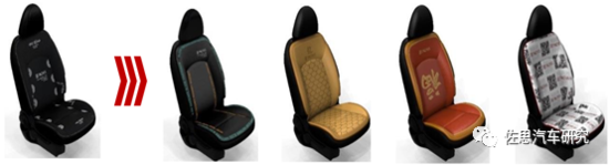 例如泰极爱思与日本世联株式会社合作的可更换面套座椅。用户可按照自己的审美需求随时更换座椅面套。针对共享汽车的发展,可将公司 LOGO 或二维码印刷在座椅面套上,以便提供信息传播、价格计划、预购订单、在线结算等商业服务。