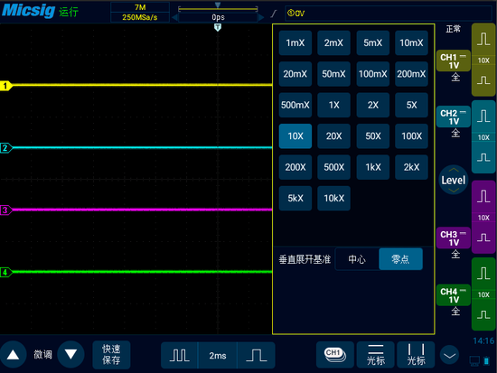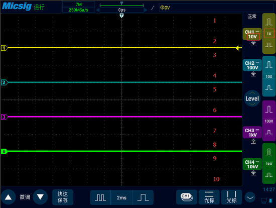除了在进行测试前,应估算被测信号的幅度大小之外,我们也应确认示波器的量程范围和示波器的基线是否对齐零点。如图可知,在1X档位下,最大垂直档位是10V,示波器纵坐标上一共是10格,所以此时最大量程是100V,其他档位下同理。而如果示波器的基线没有对齐零点,则需要对示波器进行自校准,这种情况一般出现在长时间没有使用示波器,或者所处环境温度、海拔高度出现了比较大的变化时候。