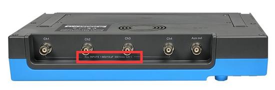 在示波器通道口附近,写有ALL INPUTS 1MΩ//14pF 300Vrms CAT I