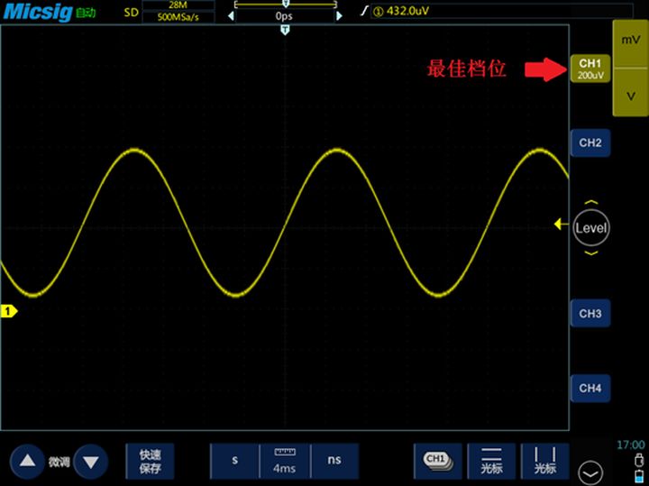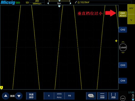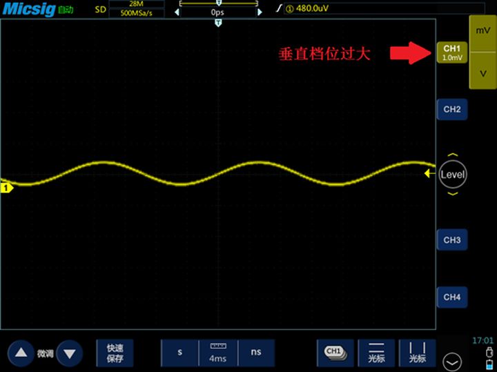 信号必须以合适的幅度(即垂直方向的大小)显示在屏幕上。垂直档位过小,信号波形会超出屏幕,不能完整显示;垂直档位过大,不仅看不清楚信号的细节,看起来也不舒服;