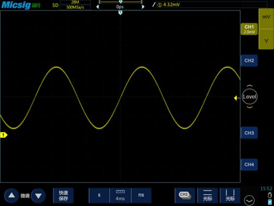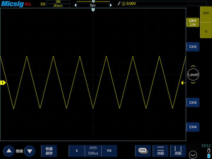 按下“自动”按键以后,示波器会根据信号的参数进行自动调节,让信号波形以合适的幅度和 时基稳定显示在屏幕上。