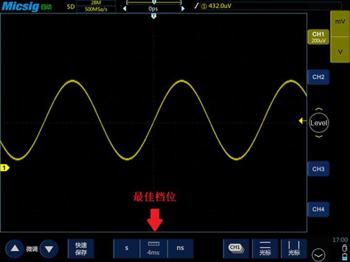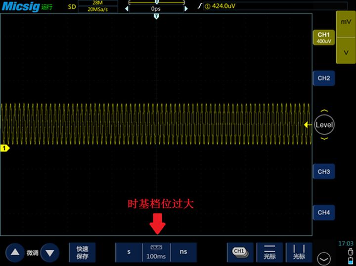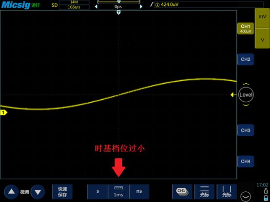 信号必须以合适的时基(即水平方向上的时间长度)显示在屏幕上。如果时基档位过小,信号波形被拉伸的太开,也看不了完整的周期。时基档位过大的话,信号波形被压缩在一起看不了细节。