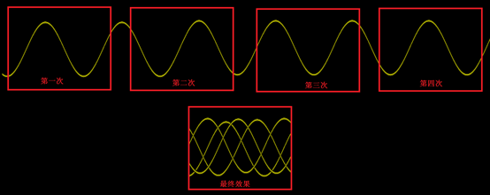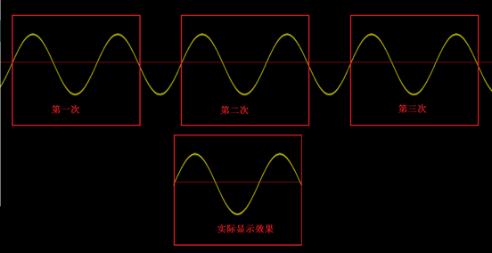 如下图,示波器没有触发的时候,会随机抓取信号(自动模式)并生成图像,由于信号是连续不断的,随机抓取的位置并无规律,这些静态的图像逐个显示,就像放电影一样,组合在一起就形成了动态的显示,最终在屏幕上的效果就是看到波形来回滚动,如下图所示: