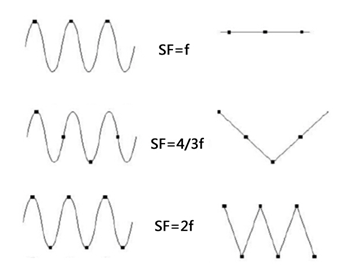 我们比较常见的奈奎斯特采样定理:当对一个最高频率为f的有限信号进行采样,采样率SF必须大于f的2倍以上才能从采样值完全重构原来的信号,这里f称为奈奎斯特频率,2f成为奈奎斯特采样率,下面用正弦波为例来模拟这个采样过程: