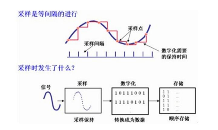 示波器的“采样率”,顾名思义就是“采样的速率“,也就是单位时间内将模拟电平转换成离散的采样点的速率,我们常见的采样率1GSa/S就表示 每秒采样1G个点,其中Sa是Samples的缩写。采样的过程如下图所示: