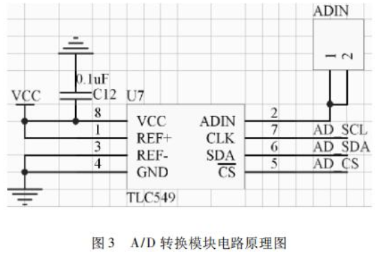 A/D 转换模块的核心硬件采用 TLC549,它是CMOS 串行的 8 位A/D 转换器,该集成电路内置一个8位开关电容逐次逼近型ADC,A/D 芯片转换时间为 17us,支持电压为 3V ~ 6V。TLC549 的使用只有输入/输出时钟,输入随着芯片选择( CS)的控制输入数据。TLC549 的输入/输出时钟的输入频率高达 1.1MHz。A/D 转换模块的设计原理图,如图3所示: