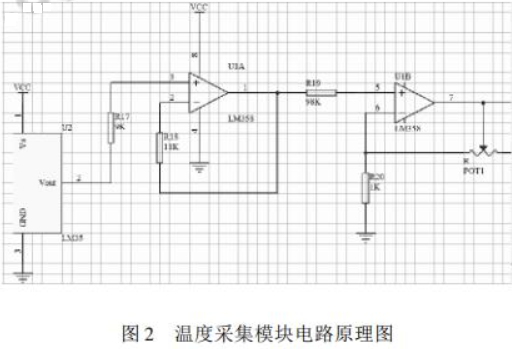 传感器是信号输入的第一个环节,也是整个测试系统性能的关键环节之一,因此对传感器的正确选用显得尤为重要. 在本系统中,温度采集模块的核心硬件采用 LM35 温度传感器,该器件有很高的工作精度和较宽的线性工作范围,其输出电压与摄氏温度线性成比例,温度每上升 1℃,电 压 上 升10ms. LM35 无需外部校准,可以提供 ± 1 /4℃ 的常用室温精度. 从经济适用等多方面考虑,系统采用LM35 温度传感器和 LM358 放大电路进行温度采集模块的设计,设计原理图如图2 所示。图2 中,经过 LM35 传感器采集后的微弱电压通过 LM358 放大电路放大 10 倍后送入单片机。