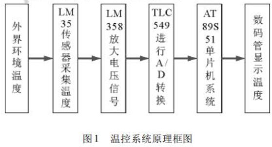 温度采集显示系统电路由温度采集模块、A/D转换模块、单片机控制模块、数码管显示模块和下载模块组成。电路工作原理是:首先由LM35 温度传感器采集外界环境的温度,经LM358 放大10 倍后以电压形式输入到 A/D 采样电路,由A/D 转换器TLC549 将温度的数字量值传送给单片机系统,再有单片机系统驱动数码管显示温度。本文设计的基于 LM35 的单片机温度采集显示系统的温度测量范围为 25℃ ~ 80℃温度采集显示系统电路是一个开环控制系统系统原理框图如图1示: