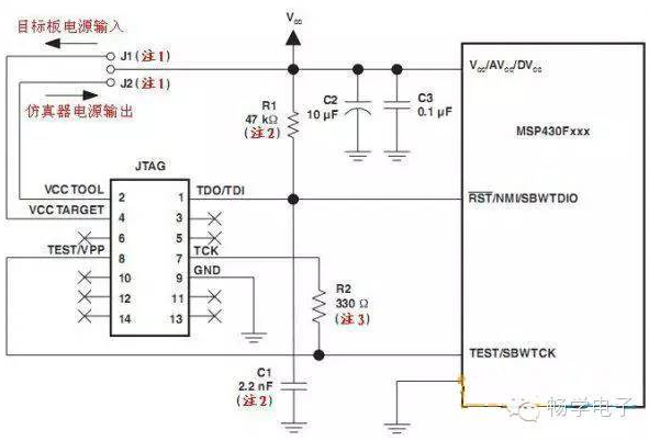 注1:可以短接J1跳线(使用目标板电源供电)或者短接J2跳线(使用仿真器给目标板供电)。(注意,J1、J2跳线应位于用户的目标板上,用户在设计MSP430系统板时应设置此两跳线用于切换电源供电方式。)