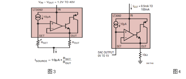 若无需更改恒流源电流,则RSET选用固定高精度低温漂的电阻即可。若想实时调节电流,RSET可选用数字电位器(如ADI公司产品AD5610),用MCU来控制。LT3092的SET引脚还可以直接连接DAC,用MCU直接控制更是一种方便简单又省成本的方案,如图4。