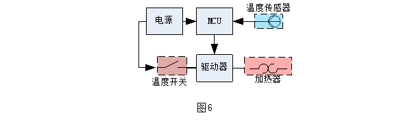 恒温控制电路由加热器 + 温度传感器 + 温度保护器 + 控制器构成,如图6。温度开关用于加热失控时的过温保护,MCU接受来自温度传感器的反馈,利用PID算法去控制驱动器调节加热器的功率输出,达到恒温控制的目的。