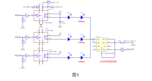 由于分光测色仪用到多个不同波长的LED,可以让每个LED配上一个恒流源,当然更好的方案是只用一个恒流源然后用模拟开关切换通道,这样更省成本。ADI公司有一款产品(型号ADG452)单芯片集成4通道模拟开关。较低的导通电阻(4Ω);每通道100mA的工作电流;快速的开关频率(tON = 70ns,tOFF = 60ns)。电气性能完全满足设计需求,方案电路实现如图5。
