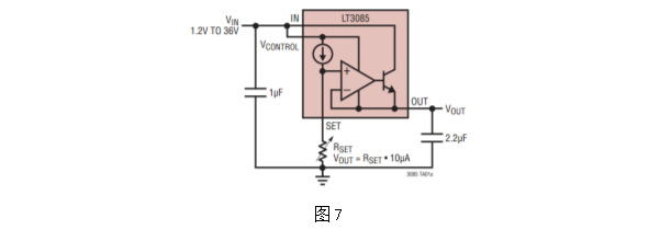 加热器可以是恒压驱动,用场管作为开关,MCU用PWM方式控制调节。但由于PWM方式控制频率较高且信号存在突变,会对电路系统造成较大的噪声干扰,进而影响用于精密测量的模拟电路。另一种方案是采用恒流驱动加热器,借鉴上述LED恒流源电路方案,选择输出电流更大的恒流源芯片(如ADI公司产品LT3085),输出电流达500mA,其他参数、功能与LT3092类似,功能框图如图7。