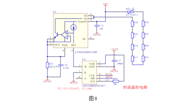 配上数字电位器,MCU可以实时调节电流变化,以控制加热器的功率输出。并且恒流方式调节频率低、过程平缓不会引起电压信号的突变。部分电路原理图如图8。