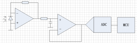 光电转换电路一般采用光电二极管(PD) + 运放 + 模数转换器(ADC)方案(如图10)。由PD采集反射光,由运放流压转换并放大信号,然后ADC转换为数字信号给MCU。由于PD工作于光伏模式,因此负责流压转换的运放需要超低偏置电流;为了提高分辨率,ADC需要尽量高的处理位数。
