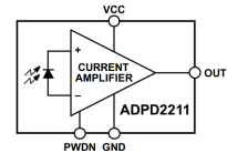 考虑使用多个高性能分立器件硬件成本过高,在性能达标的条件下可以尽量选择集成度高的器件。ADI旗下有一款产品(型号:ADPD2211),自带24倍电流放大器使之拥有超高的灵敏度,省去了外置运放;极好的脉冲响应(典型带宽达400KHz);超低电流噪声(90fA/√Hz)。其内部功能框图如图5。在输出端加上采样电阻到地,即可实现流压转换,省去众多的外围电路。其功能框图如图11。