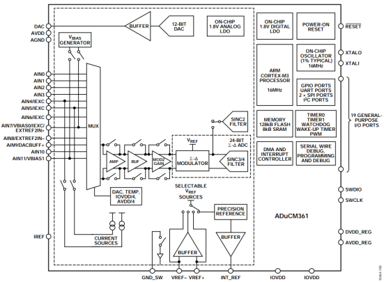 ADuCM361内置32 位ARM Cortex-M3® 处理器,常见的外设如UART、SPI、IIC、Timer、DMA、DAC、Watchdog都有集成,非常方便使用;自带一个片内32 kHz 振荡器和一个内部16 MHz高频振荡器使硬件设计可以省去外部晶振电路;最令人刮目相看的是它集成了4 kSPS、24 位高性能多通道Σ-Δ型模数转换器(ADC),可在全差分和单端模式下工作,ADC模块集成硬件滤波器,可以选择配置高速滤波器来进行步进变化检测,也可选择低速滤波器用于精密测量;内置一个低噪声、低漂移带隙基准电压源,也可选择外部基准电压源;附带的可编程激励电流源,可以应用于许多电流驱动型的传感器。