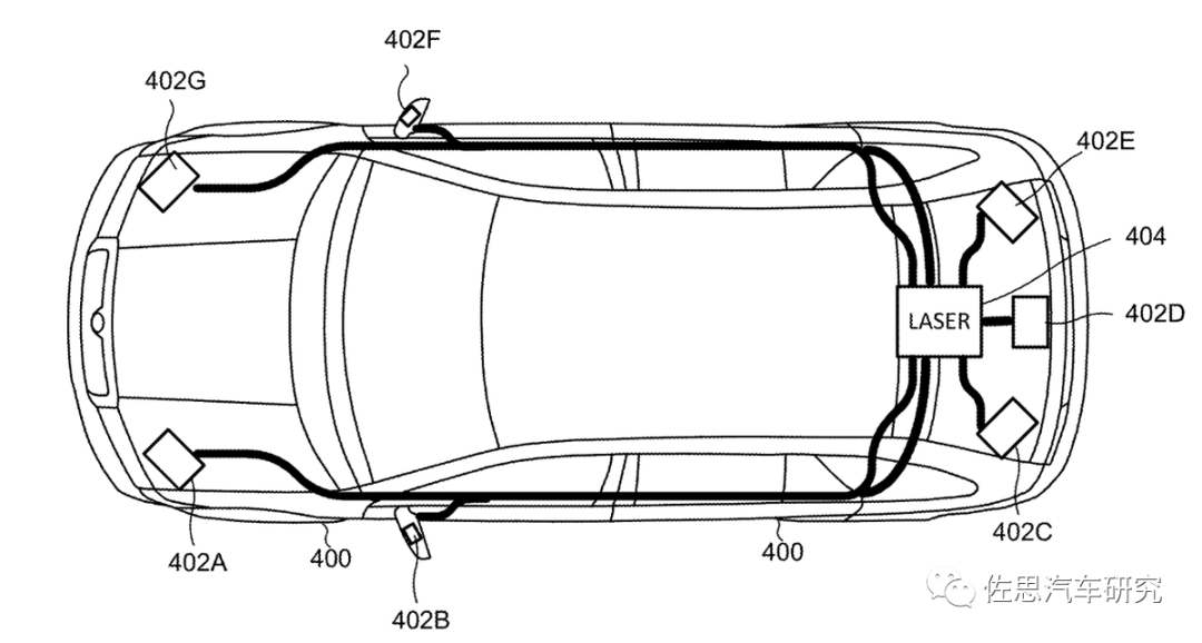 Luminar独家采用光纤激光设计,光纤激光已经成熟应用二十年以上,其功率高,用光纤传递激光,一个激光源可以对应多个激光雷达,激光源可以放在车内任何地方,让激光雷达布局非常灵活,体积也可以大大缩小。如上图所示,404是光纤激光源,可以布局7个激光雷达。
