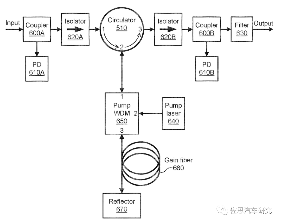 关于激光功率的放大,Luminar申请了专利。其专利是用二级大模场掺铒光纤(EDFA)放大器将一个种子源激光调制为一个脉冲宽度至20纳秒以下,脉冲重复频率低于100MHz,占空比低于1%的脉冲激光系统。Luminar的专利核心一个种子源激光,另一个是掺铒光纤放大器。