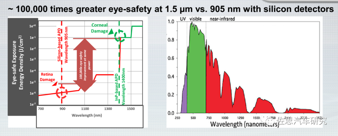 要提升功率,就不得不考虑人眼安全,对于常用的905纳米来说是不合适的,只有1550纳米的InGaAs,它和905纳米的硅光电探测器比要安全太多,可以放心地加大激光器的功率。Luminar就是以使用1550纳米的InGaAs为特色的,其使用的激光器的功率是传统硅光电系统的40倍,不仅提高信噪比,减小脉冲宽度至20纳秒以下,脉冲重复频率低于100MHz,占空比低于1%。同时提升了有效距离,而且1550纳米也是全天候的,在雨雪雾天,都基本没影响,Luminar强调即使10%反射率的物体,有效距离也可以达200米,理论最远距离高达1公里。