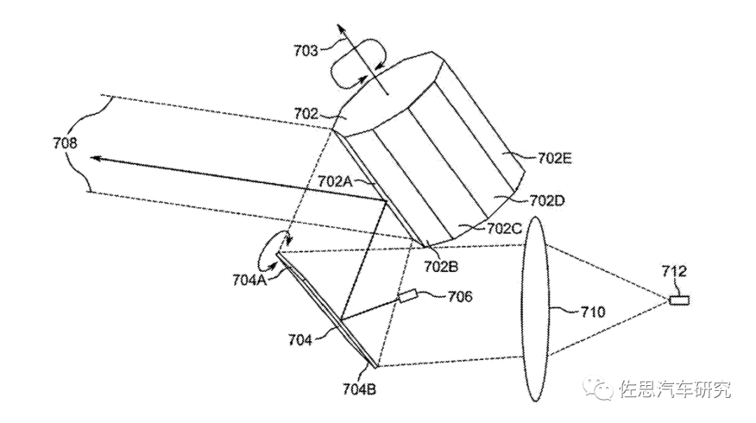 Innovusion图达通激光雷达的扫描器主要由多边形棱镜702和电流扫描振镜704组成,706是激光源,712是激光反射接收光电二极管,710是反射接收聚焦透镜。702做水平扫描,704做垂直扫描。