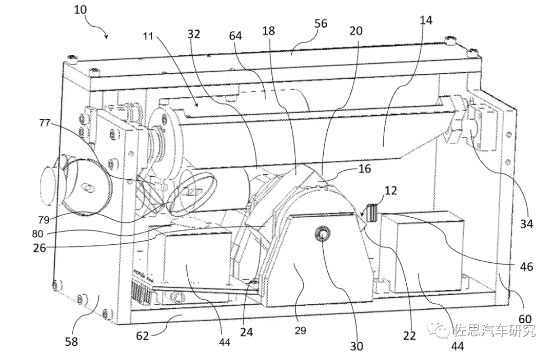 核心元件是两个扫描器,一个是水平扫描器12,它包含一个矩形立方体16,有18、20、22、24四个反射面,也就是多面体扫描镜,也叫多边形棱镜,29为支架,30为电机主轴,32为电机。56、58、60是外壳,44是接收模块,80是接收聚焦镜,即上文的170的一部分。14为垂直扫描器,64为垂直扫描器电机。46是DOE,即衍射光学元件,衍射光学元件(Difractive Optical Element,DOE)是相位元件,它使用嵌入在元件中的薄微结构将输入激光束控制为各种输出轮廓和形状。衍射光学器件可实现许多功能和光操作,而这在标准折射光学器件中是不可行的。DOE可适用于多种类型的输入激光(如单模高斯激光、多模激光等),在激光焦面上形成指定的光斑形状和光强分布,还可以实现在激光传播方向特定的光强分布。