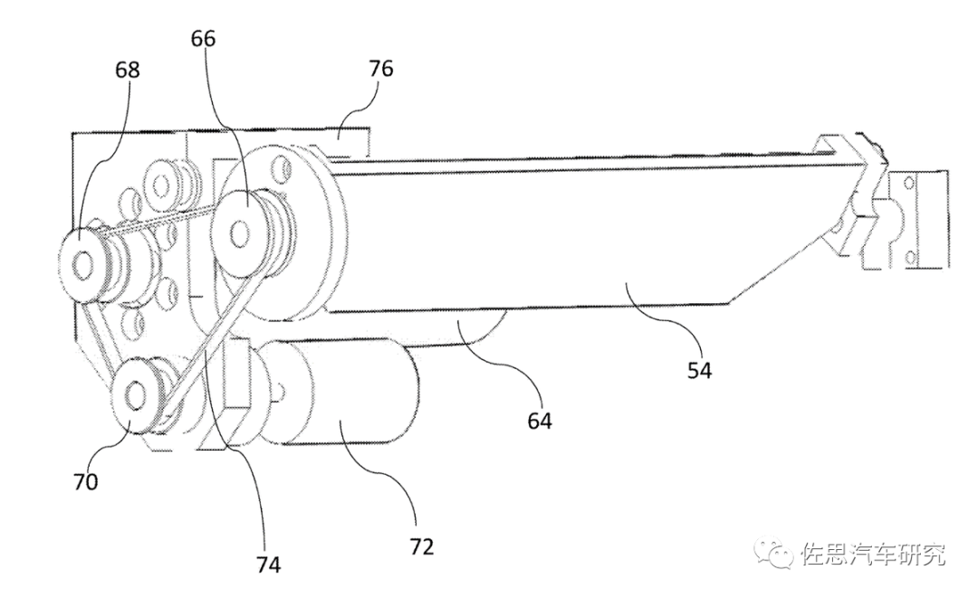 垂直扫描器如上图,64为电机,这是一种特殊FAULHABER直流无刷电机,与传统铁芯直流电机的区别在于转子特有的空芯杯斜绕组的自承式铜线圈。这一开创性设计的固有特性包括非常低的转子惯量、无齿滞或转子位置。这些特性决定了电机具备独特的高功率密度和高动态性能。最初由 Fritz Faulhaber Sr. 博士发明,并在1958年注册,体积很小,使用最高级的钕铁硼磁体,价格昂贵。74为皮带,66、68、70是滑轮组,72是编码器,72与64通过齿轮连接。54是反射板。