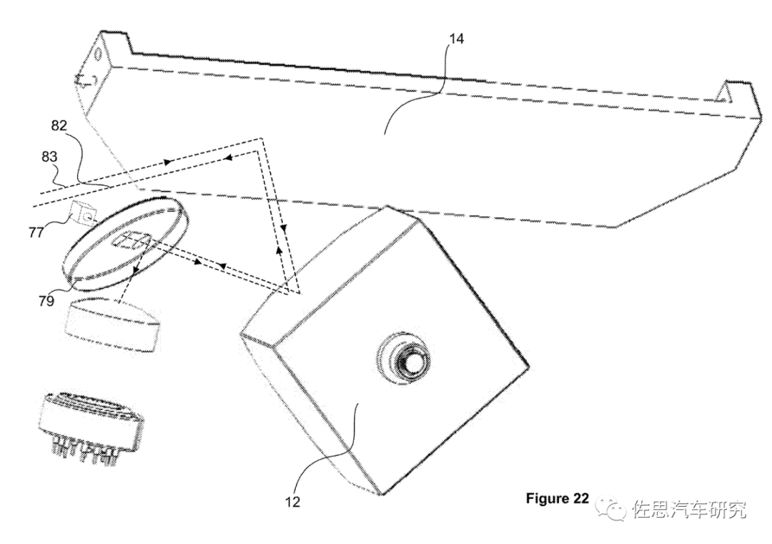 77为准直透镜(实际是包含了两个透镜),激光器124发射的激光经过准直透镜从点球状变为平行光束,再经过重叠环形镜79发射,82为入射光,83为反射光。79的反射部分就是上文说的124。