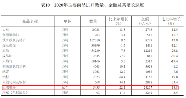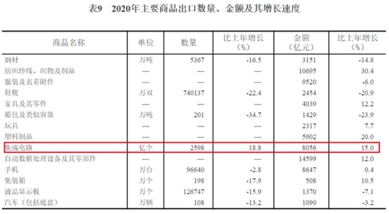 在对外经济方面,2020年集成电路出口数量达2598亿个,同比增长18.8%,出口总额达8056亿元,同比增长15%;2020年集成电路进口数量为5435亿个,同比增长22.1%,进口总额为24207亿元,同比增长14.8%。