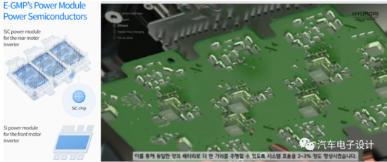 现代在推的E-GMP平台在主逆变器功率器件使用碳化硅(SiC)模块,相比较于400V系统,系统效率提升2%~3%,整车续航能力提升约5%,这对于接下来SiC模块的用量会有很大的提升。
