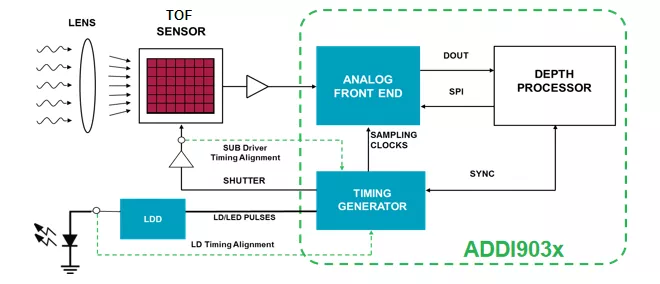 ADI是为数不多拥有技术专长、可提供兼具高性能和成本效益的ToF解决方案的公司之一。ADI的脉冲ToFCCD系统,使用高性能ToF CCD和集成了12位ADC、深度处理器(将来自CCD的原始模拟图像信号处理成深度/像素数据),以及高精度时钟发生器(为CCD和激光器生成驱动时序)的ToF模拟处理前端ADDI903x。