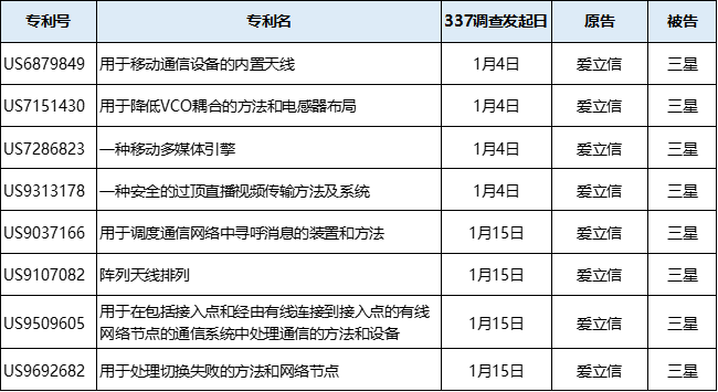 在此期间,1月1日、4日,爱立信以US6879849等4项专利被侵权为由,先后在德州东区法院和ITC控告三星。1月15日,爱立信再次以US9037166等4项专利被侵权为由,先后在德州东区法院和ITC控告三星。