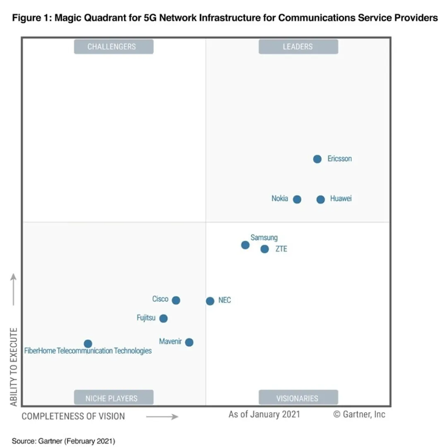 据Dell'Oro 2020年第一季度的数据,华为以35.7%的市场份额排名第一,爱立信以24.6%的市场份额排名第二,诺基亚以15.8%的份额排名第三,三星以13.2%排名第四。在Gartner近日发布的《通信运营商5G网络基础设施魔力象限》报告中,三星在远见者象限占有一席之地,且是最接近由爱立信、诺基亚和华为组成的领导者象限的公司。