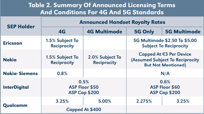 专利许可费率一般由掌握专利的权利人自行公布或由相应领域专利池如Avanci等给出标准,从来没有统一的行业范式,特别是前沿技术领域。以5G为例,早在2017年,就有5G标准必要专利权人陆续公布了许可费率,但各家公布费率各不相同。最早公布费率的爱立信给出的5G标准必要专利费是每部手机最低2.5美元,最高5美元。而次年秋诺基亚宣布5G标准必要专利的许可费上限为每台设备3欧元。InterDigital对于多模5G手机,每部收取0.36美元到1.2美元不等的专利使用费(谈判前)。而高通宣布的许可费率为,5G品牌单模手机售价的2.275%,品牌多模手机售价的3.25%,手机售价以500美元为上限,据此计算,一部同时支持3/4/5G的手机最高需要交16.25美元专利使用费。