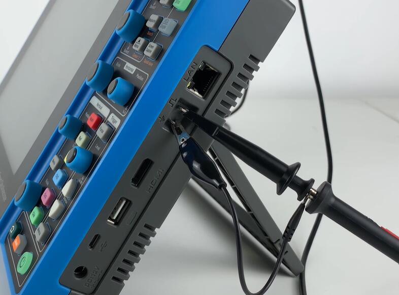 第三步,将探头探针钩住校准信号输出端,探头接地夹夹住接地端