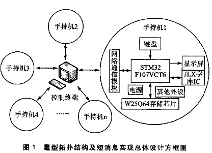 手持机是互联互通功能实现的终端,其短消息功能实现的方案是:在STM32F107VCT6主控芯片的调度下,相关外围软、硬件外设相互配合,完成短消息的4个功能模块,即短消息发送(包括文字编辑)、短消息接收、短消息存储、短消息删除。
