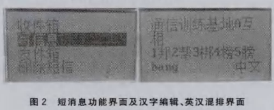 在本设计中,短消息是由手持机编辑并发出,以特定格式的信令通过控制终端的解析、转发到目的手持机,手持机短消息菜单界面分为收件箱、写信息、发件箱、删除短信4个子菜单,其界面如图2左图所示。