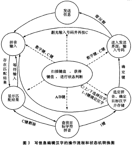 “写信息”菜单的代码程序参考了当前市场流行的T9输入法的界面和基本操作流程,并根据应用需求做适当改进。不同的输入内容可通过“#”键进行循环切换,数字输入采用直接按键的方式,英文大/小写字母、标点符号以快速连按的方式进行选择并输入,程序设计相对简单。以汉语拼音的方式实现汉字输入的方法需要随时根据键盘和显示屏的显示内容进行状态转换,过程相对复杂。