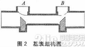 根据超声波所走过路径的不同,基表有V型、Z型等安装方法。安装方式的不同对生产工艺的要求也不同,进而影响着热量表的精准度、可靠性。参考文献[2]采用的是V型安装方式,由于该方式能精准地测量不同流层的水流状态,理论上该方案准确度较高。然而该方案是通过管道壁对超声波信号进行反射,由于管道材质、表面光滑度等原因,超声波在通过管壁反射时有可能会在反射面处发生折射、散射等情况干扰测量,为避免这些情况的发生就需要对基表的材质以及内表面光滑度的生产工艺提出较高要求,这些要求无疑会提高生产成本,拖延生产进度。参考文献[3]选用的是Z型安装方式,该方式可以解决反射的问题,而且生产工艺较为简单,但由于传播距离较短,不利于时差法的测量。针对上述问题,本文设计了如图2所示的采用U型安装方式的基表,其中A、B是超声波的安装位置。