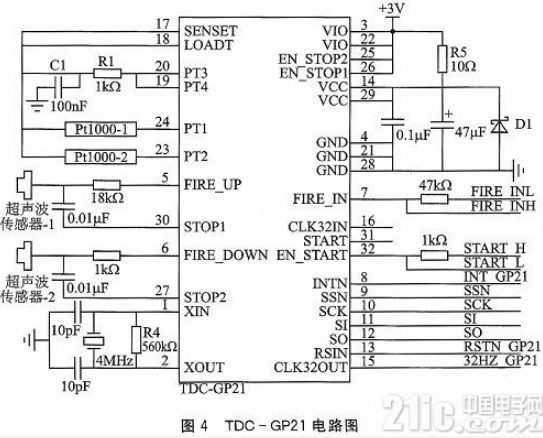芯片TDCGP21的引脚5和引脚6用来接收和发送超声波信号,由于芯片内部集成有模拟电路输入部分,因而超声波的外围电路无需过多设计,仅通过电阻和电容就可连接到换能器一端。