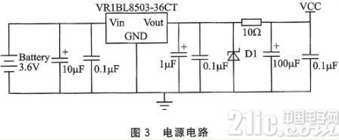 芯片对时间的测量主要是利用两脉冲电流之间的间隔时间,因此一个稳定可靠的电源电路设计对时间数字转换芯片的测量效果具有非常大的影响。为此,设计了如图3所示的电源电路。电源电路核心芯片选用了具有低功耗低压差的稳压芯片VR1BL850336CT,配以滤波电容使电源电路具有高电容性和低电感性,为TDCGP21提供了可靠的电源保证。